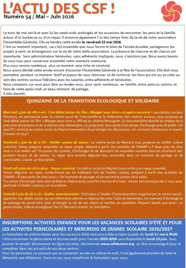 Cliquez ici pour rester au cœur de l’action et être informé des derniers évènements des Centres Sociaux Fidésiens !